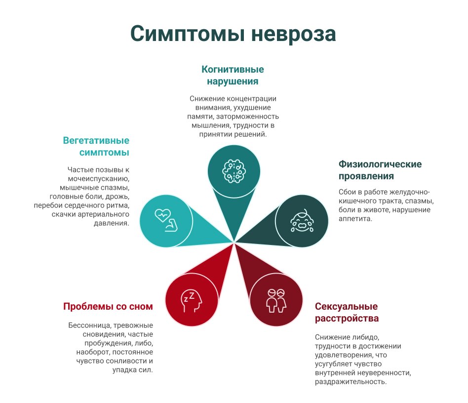 Соматоформная вегетативная дисфункция: Невроз часто маскируется под физические недуги: кардионевроз, «ком в горле», синдром раздраженного кишечника или психогенную одышку. Терапия направлена на деактивацию очага застойного возбуждения в коре головного мозга и восстановление вегетативного тонуса через сочетание психотерапии и легкой фармакокоррекции.
